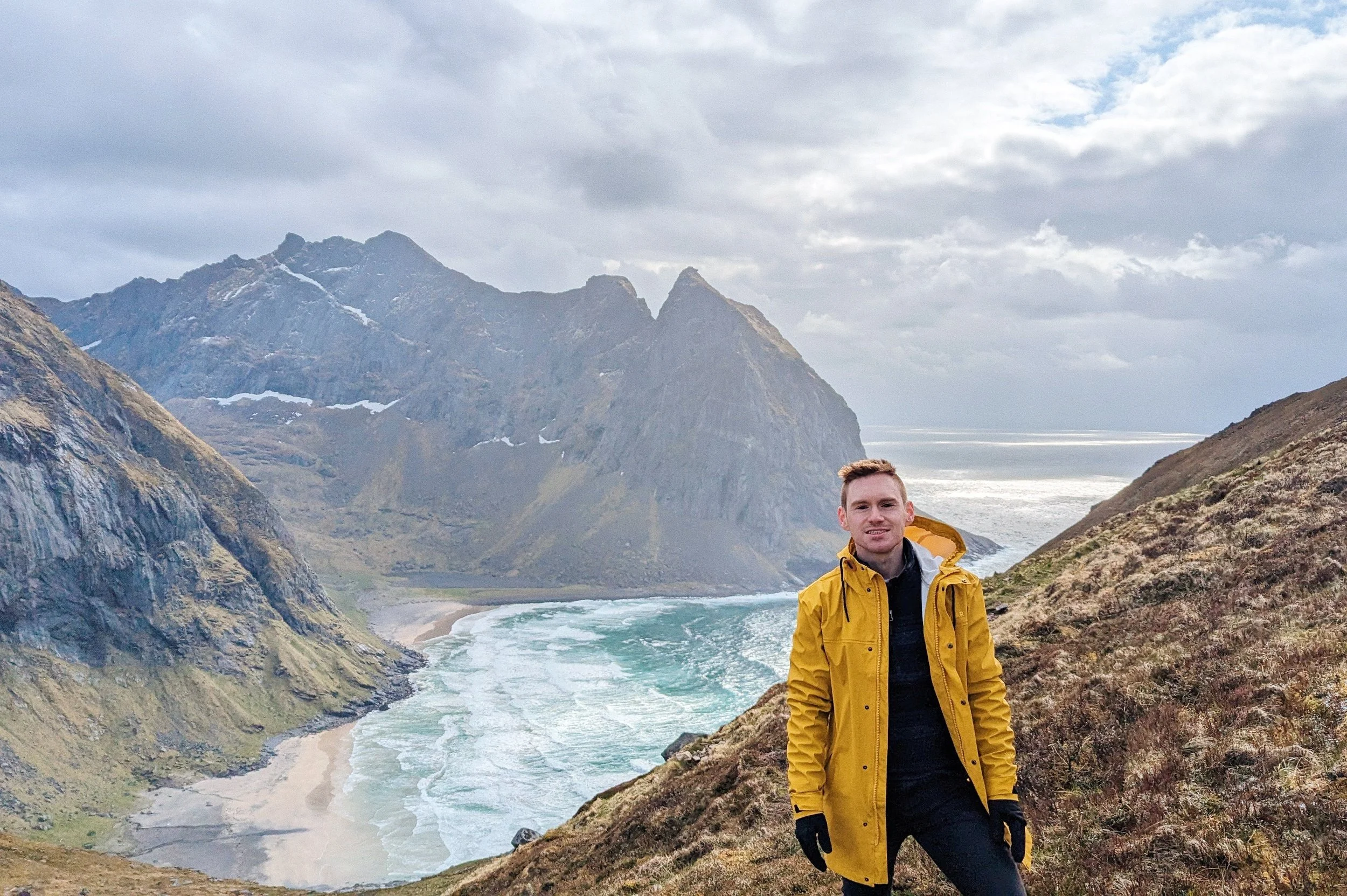 Kent Kubani standing above Kvalvika Beach in the Lofoten Islands of Norway.
