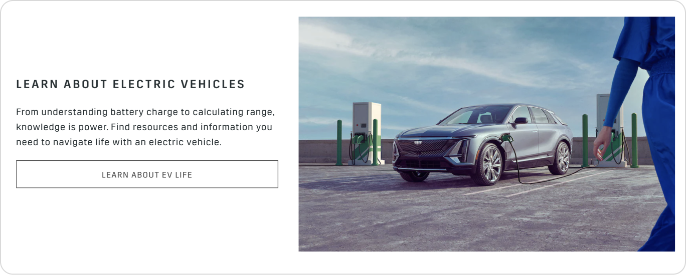 One pattern that required several variations was the masthead. Nearly every page on Cadillac.com has a masthead of some kind, so creating several types based on page content made the most sense. For example, Model Overview (MOV) pages each have a masthead that serves a different function than a masthead on a Discover Cadillac page. MOV pages serve to educate a user on the details of a single vehicle, so the mastheads require the vehicle name, model year, a positioning statement, and general availability. Discover Cadillac pages, like Cadillac Live or EV Life, each have different types of content and don’t require the same level of consistency as MOV pages. From this, we created an MOV masthead pattern, and two alternative masthead patterns that could be used as is, or adjusted as needed for non-product focused pages.
